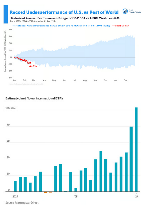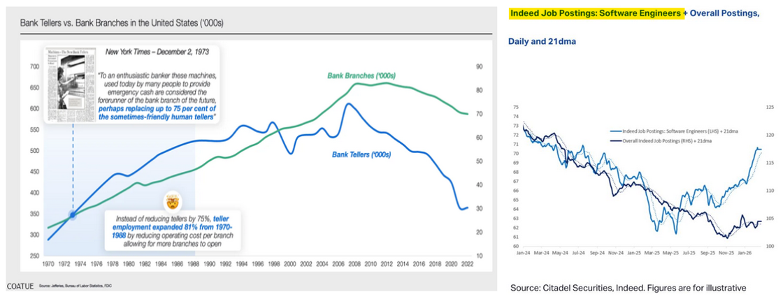AI fear is everywhere. See Citrini report earlier this week (click). "We´re all going to be replaced by AI and robots". Yet historically, more efficiency has initially led to massive job growth (see "bank teller paradox" below; source: Coatue). More generally, economist speak of Jevon´s paradox (more efficiency leads to exponentially higher deployment, more use cases, etc; illustrative: number of software engineer jobs sharply up since July25). Now: from an investing perspective things are even more complicated. Heavy Moat Investing looks at the risks of being contrarian in light of AI (see article above).