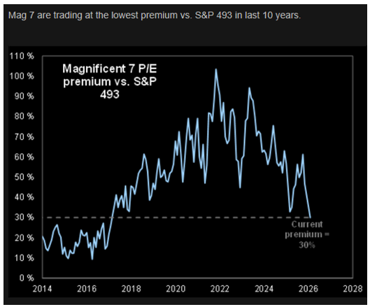 Mag7 PE-premium vs the "Rest of the market" is at a 10 year low. Market falls slightly, index concentration eases..